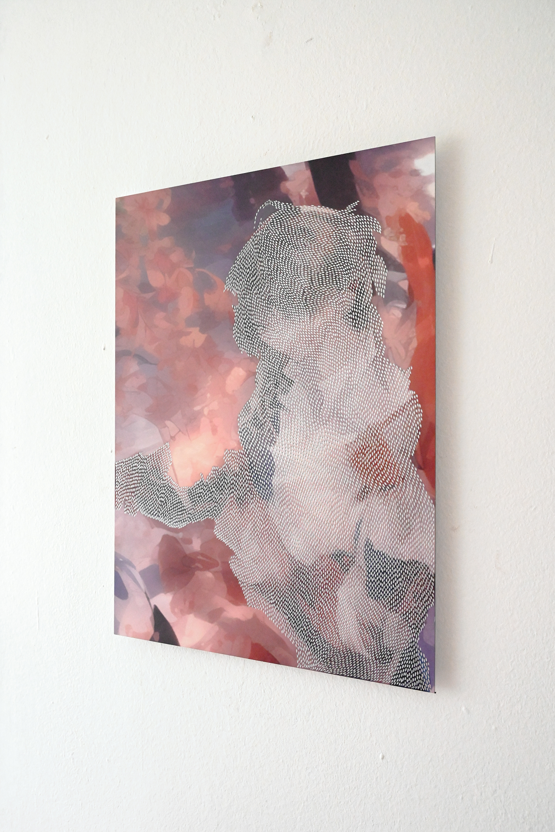 本シリーズは、生成AIによって作られたポートレート画像をアルミ複合板に印刷し、日本の伝統的な彫金技法を施した作品群です。海外で移民として生活するなかで、社会情勢や制度変更の影響を直接的に受け続ける不安定な立場に置かれてきた経験を背景として成立しています。制度上は「個人」として存在しているにもかかわらず、その輪郭が申請書類に記載される文字情報や数値データによって定義され、管理され、更新されていく。その実感と現実との乖離こそが、本作の出発点です。
