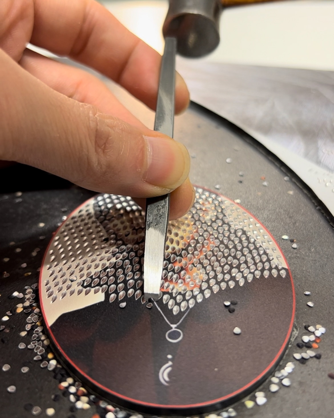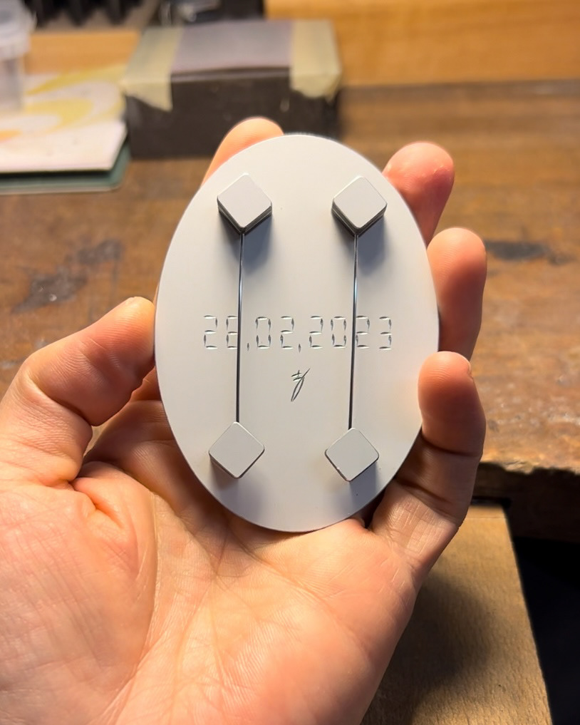 The series is governed by a strict set of rules. Only one AI-generated portrait is created per day, using the same personal information as the prompt each time. At the beginning of each month, I craft a new chisel myself and use it for all works created during that month. If an error occurs during the engraving process, the work is destroyed and restarted from the beginning. The date of image generation is engraved on the reverse side of each finished work. The project ends the moment the AI generates an image that closely resembles the artist himself. In addition, each generated image is automatically classified by another AI into one of five formats—ring, earring, necklace, brooch, or wall-mounted work—and the artist does not intervene in this decision.